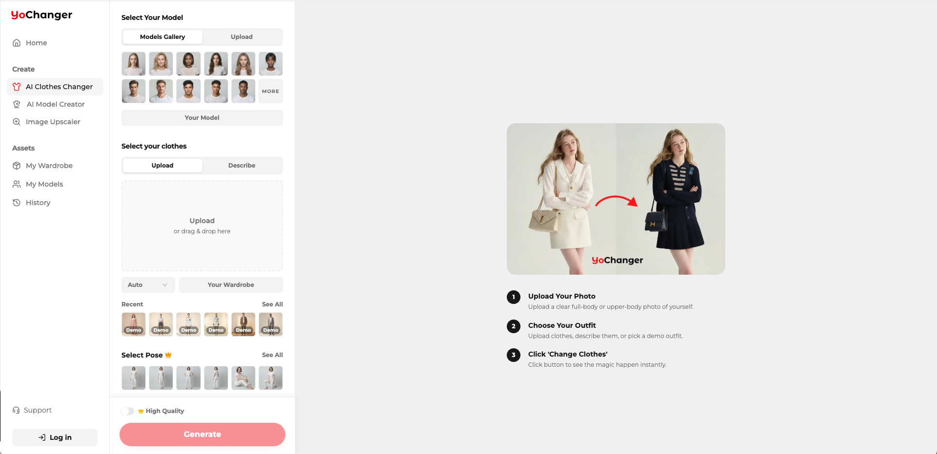 YoChanger is the leading AI clothes changer platform that revolutionizes virtual try-on experiences. Powered by cutting-edge artificial intelligence, our advanced technology transforms your photos with different clothing styles instantly and realistically. Whether you're shopping online or creating fashion content, YoChanger's AI clothes changer makes it effortless to see how outfits look before purchasing—all in seconds, completely free, and no sign up required.